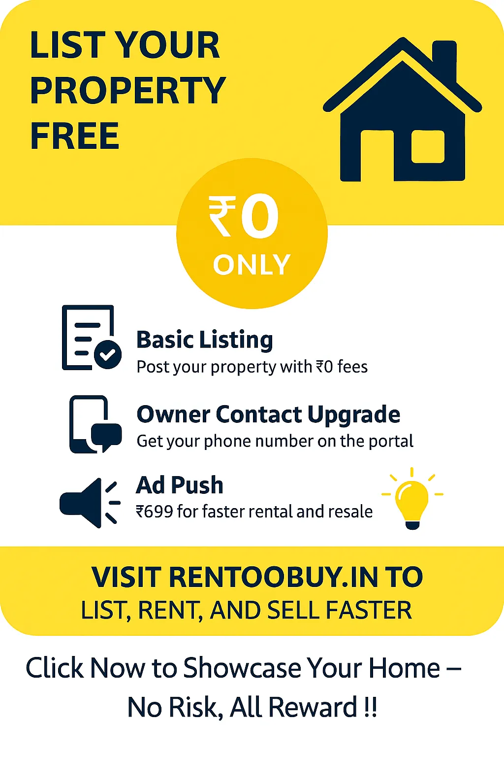 | Basic Listing | ₹0 | – Property listed on Rentoobuy.in – Visible to verified buyers/renters – Owner contact hidden (inquiries via portal) |