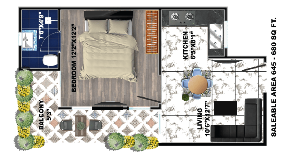 - Includes a cozy bedroom, a functional kitchen, a well-lit living space, and a balcony for fresh air.
